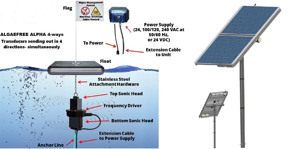 transducer hanging below the SolaRAFT float, is the premium system to prevent algae, bio film, bacteria’s and other growths