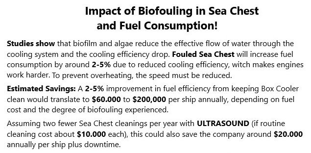 三月 2016, 我们决定将我们的供应商转变为更加高端的市场, 现代和先进的电子产品,可确保为商业运输市场提供长期功能. 重型DutyPlus 有频率和强度,防止冷却系统藻类和藤壶的生长, 冷却管, 取水口, 压载舱, 螺旋桨, 舵, 海胸部, 舭龙骨, 船首推进器和船体. Ultra Sound系统对各种污垢都非常有效.
