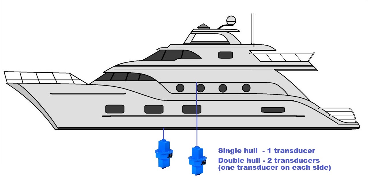 Transducer(s) hangs easy from a rope on the side and approx. 2-3m deep.