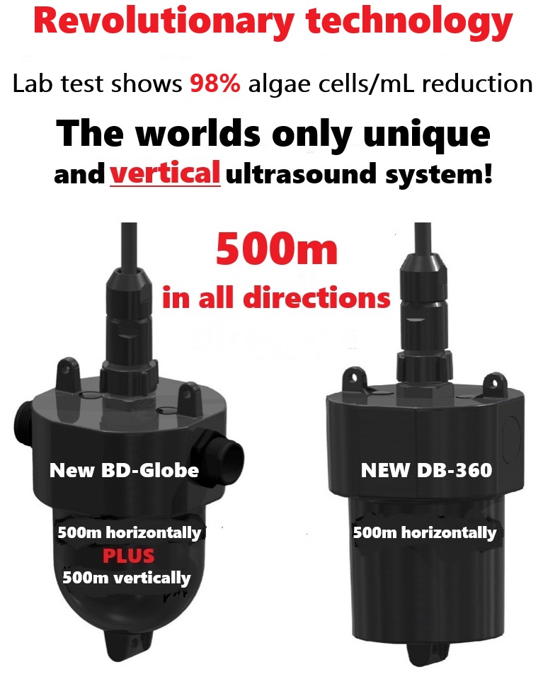Only ALGAEFREE DB-GLOBE transducer transmits ultrasound waves 500m VERTICALLY and HORIZONTALLY!